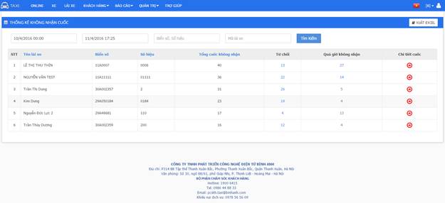- Bảng này thống kê ra những cuốc hủy hoãn của từng lái xe theo điều kiện tìm kiếm. Thao tác với bảng như sau: